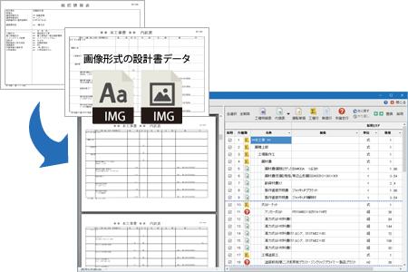 さらなる積算効率の向上と精度を追求した土木積算システムの決定版 文字情報を持たない画像形式の設計書データを取込んで、OCR(文字認識)機能で解析。データに変換し、積算することが可能になりました。これまで、手入力で積算していた画像形式の設計書も、本機能により大幅に積算業務が効率化されます。 ■画像設計書データとは?