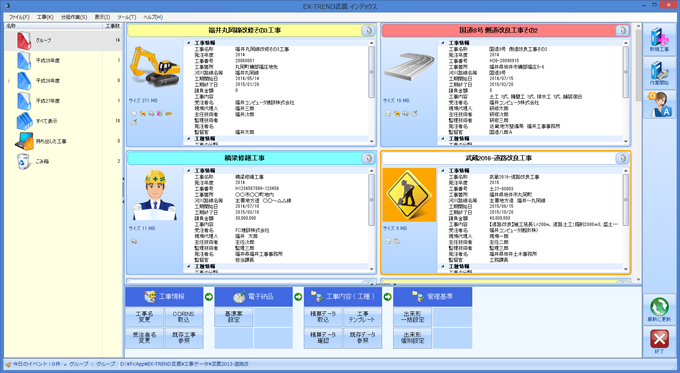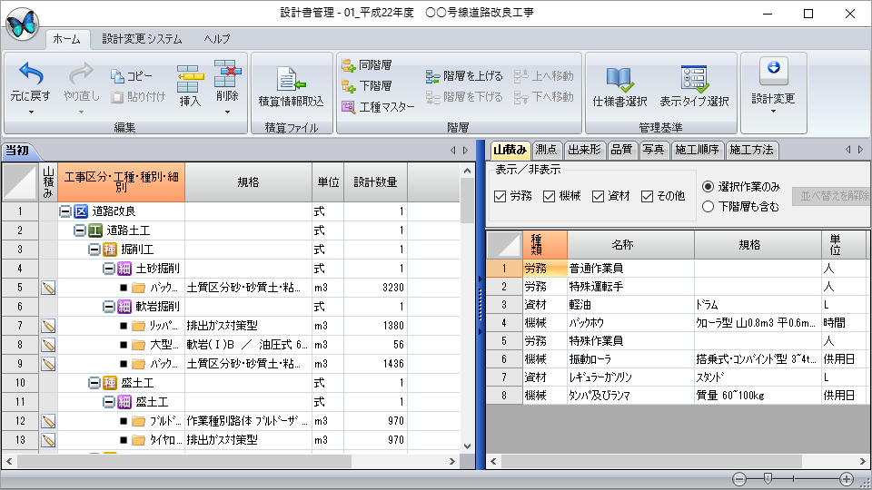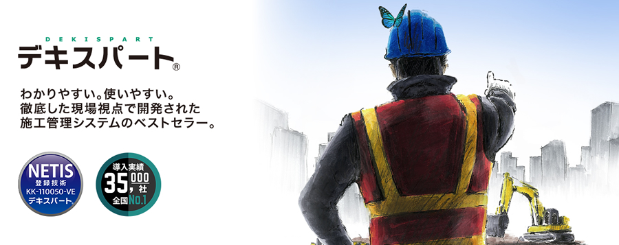 積算情報を取り込み、作業の付加情報として山積み(労務・機械・資材等)や測点、施工管理基準(出来形・品質・写真)などを「デキスパート基本部」内で管理。